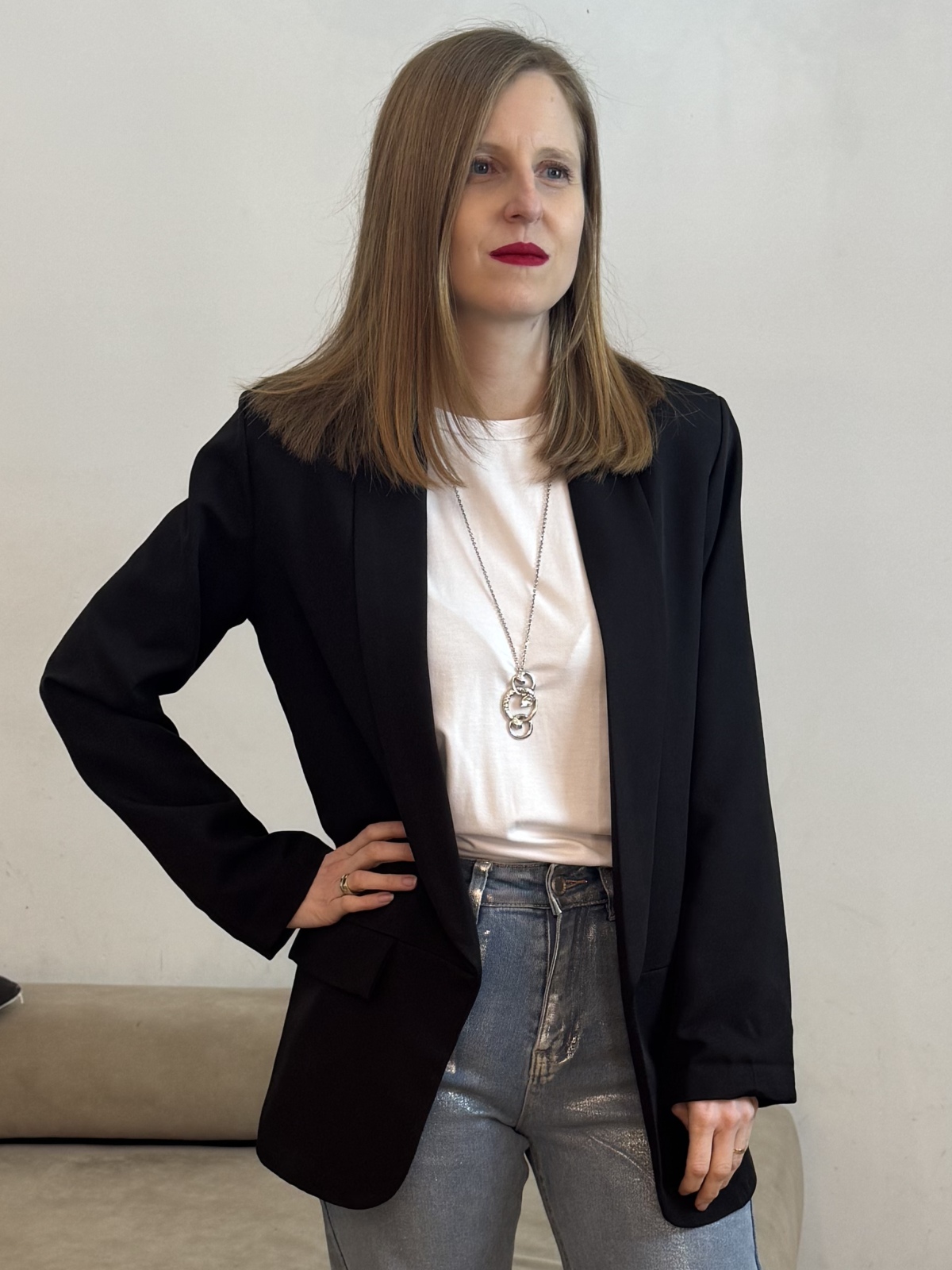 Blazer de cuello esmoquin y manga larga. Detalle de forro con estampado de leopardo visible en la vuelta de los puños. Bolsillos delanteros decorativos con solapa. Tejido fluido sin cierre frontal para un acabado ligero y versátil.