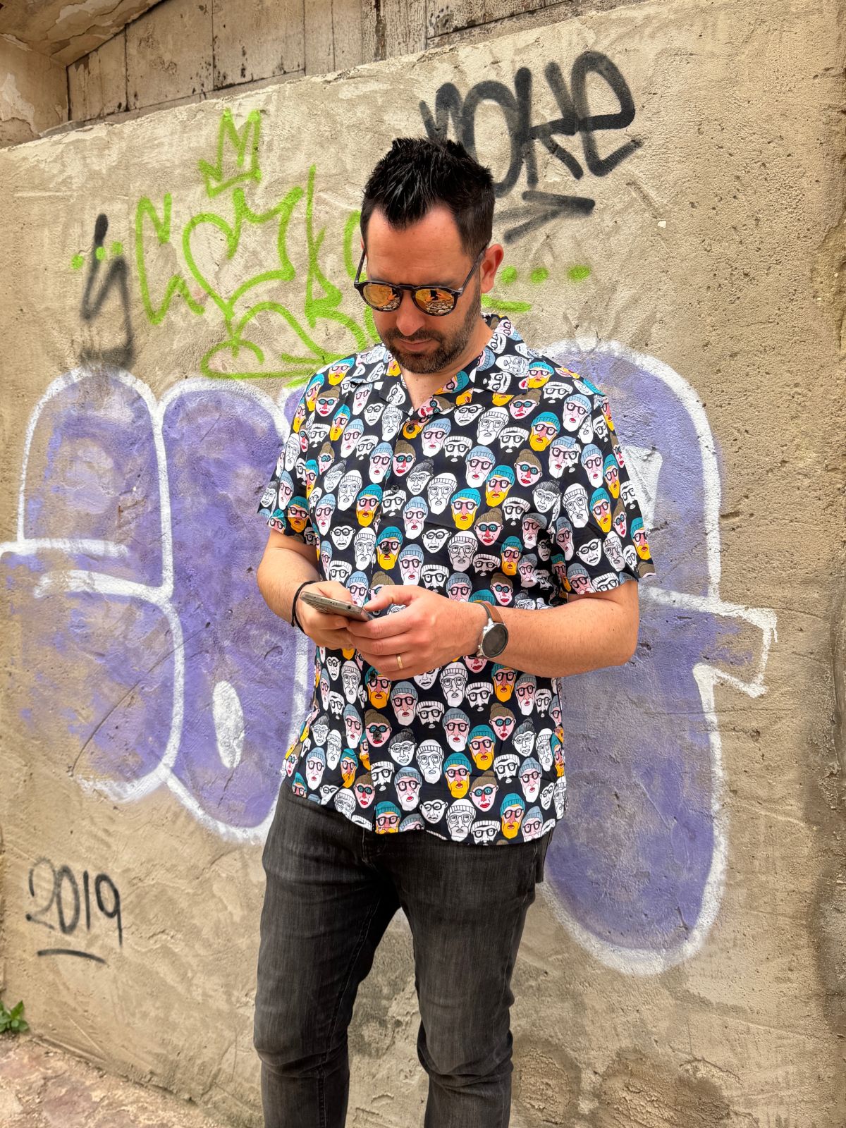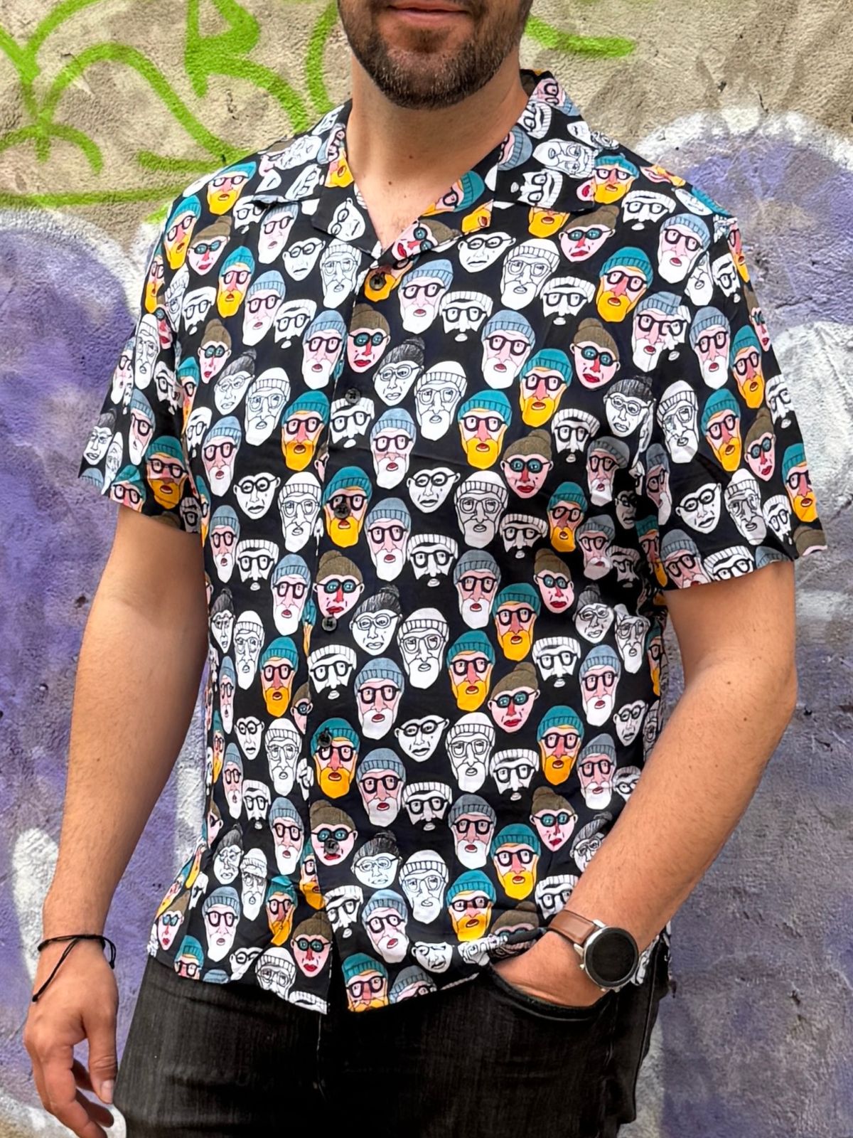Camisa de cuello bowling y manga corta. Detalle de estampado integral de motivos gráficos de rostros a contraste y cierre frontal con botones.