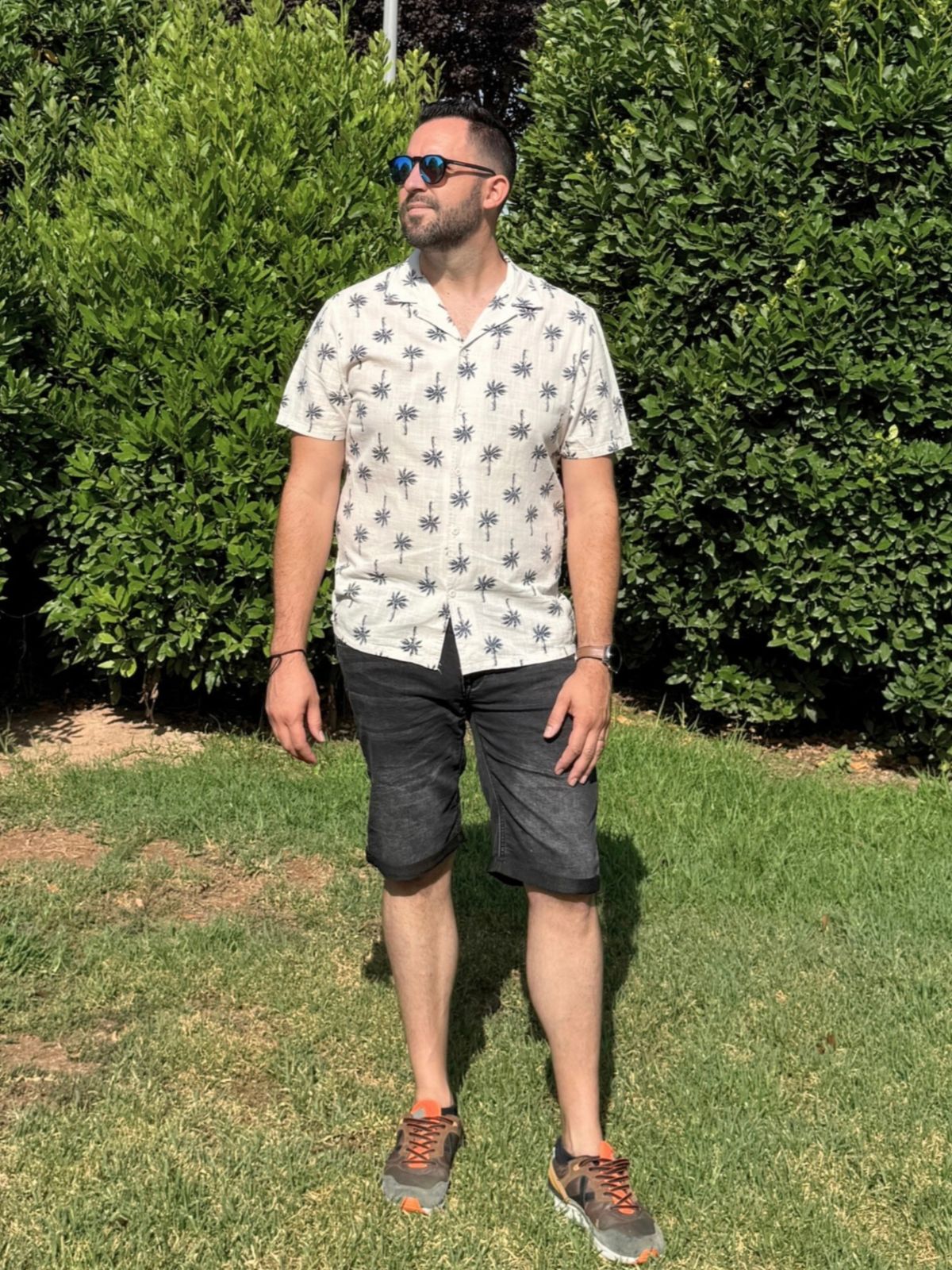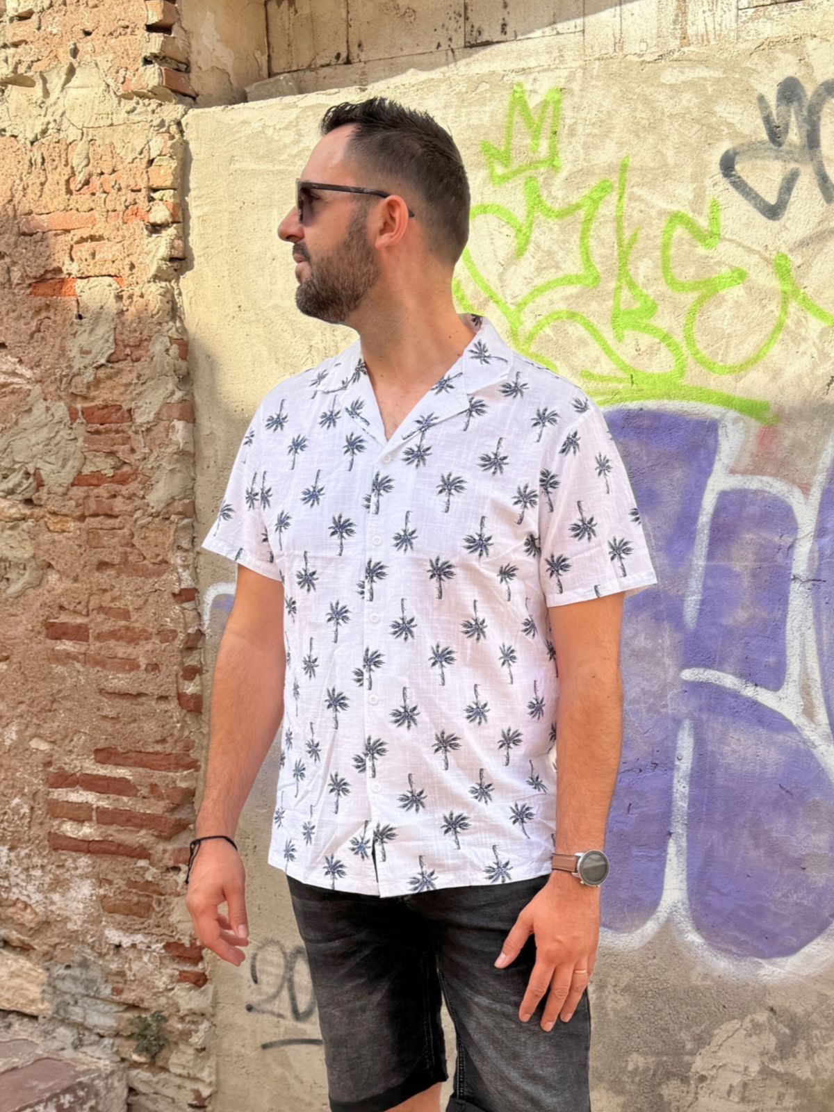 Camisa de cuello bowling y manga corta. Detalle de estampado integral de motivos de palmeras a contraste y cierre frontal con botones.
