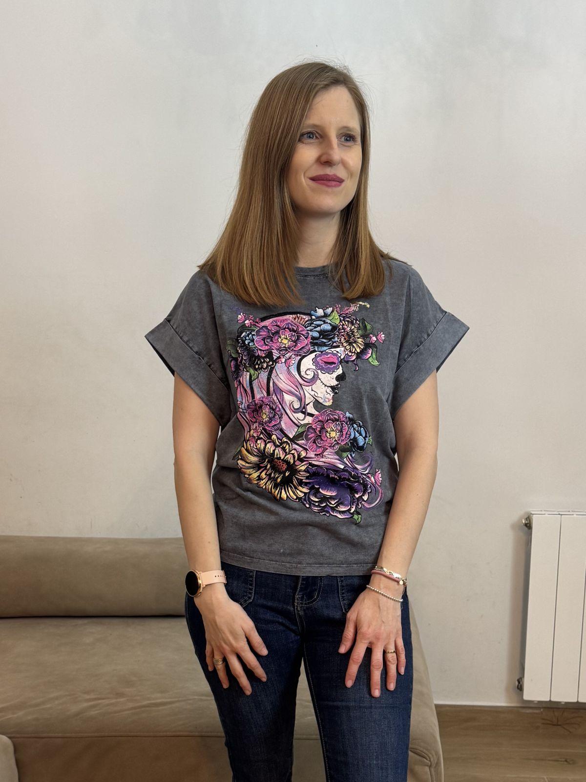 Colección cápsula de edición limitada con ilustraciones originales pintadas a mano. Camiseta Catrina Gris: Confeccionada en algodón con efecto lavado mineral. Presenta un diseño artístico frontal de Catrina con detallados motivos florales en tonos fucsia, violeta y amarillo. Manga corta acabada en vuelta.Camiseta Tigre Gafas: Confeccionada en tejido fluido color blanco roto. Destaca por su gráfico central de tigre en estilo pop-art con detalles flúor, gafas de corazón y acabados de pintura salpicada. Corte oversize de manga corta.