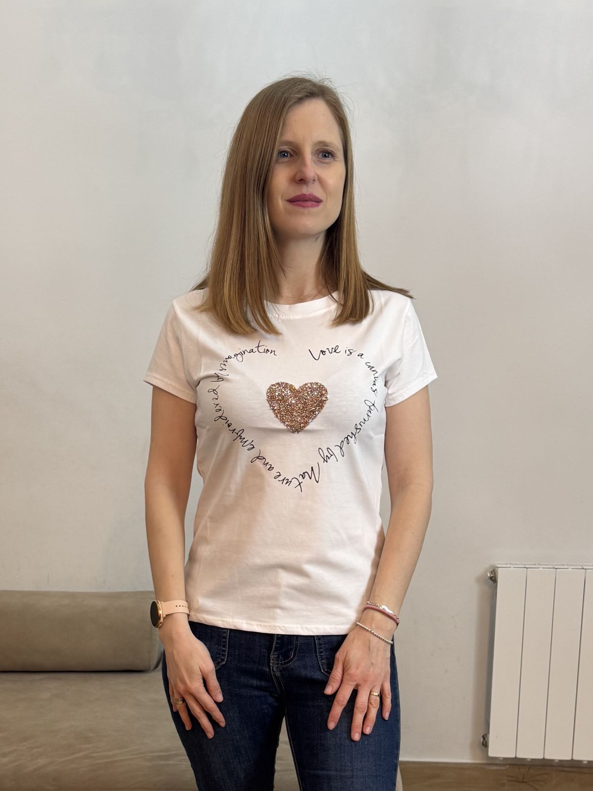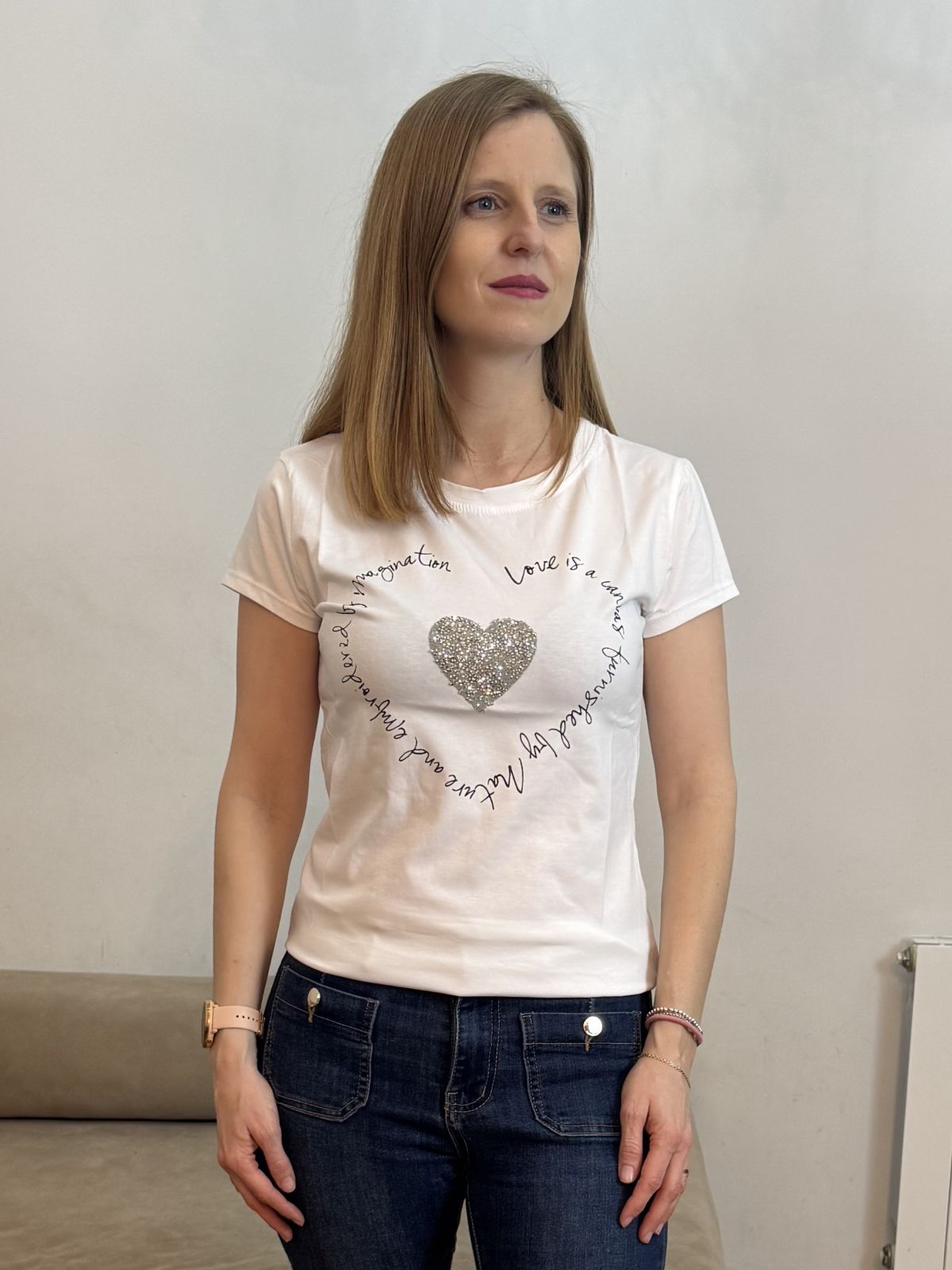Camiseta de cuello redondo y manga corta confeccionada en tejido de algodón. Detalle frontal de corazón central con aplicación de brillos en plata y texto tipográfico en contraste formando una silueta circular.