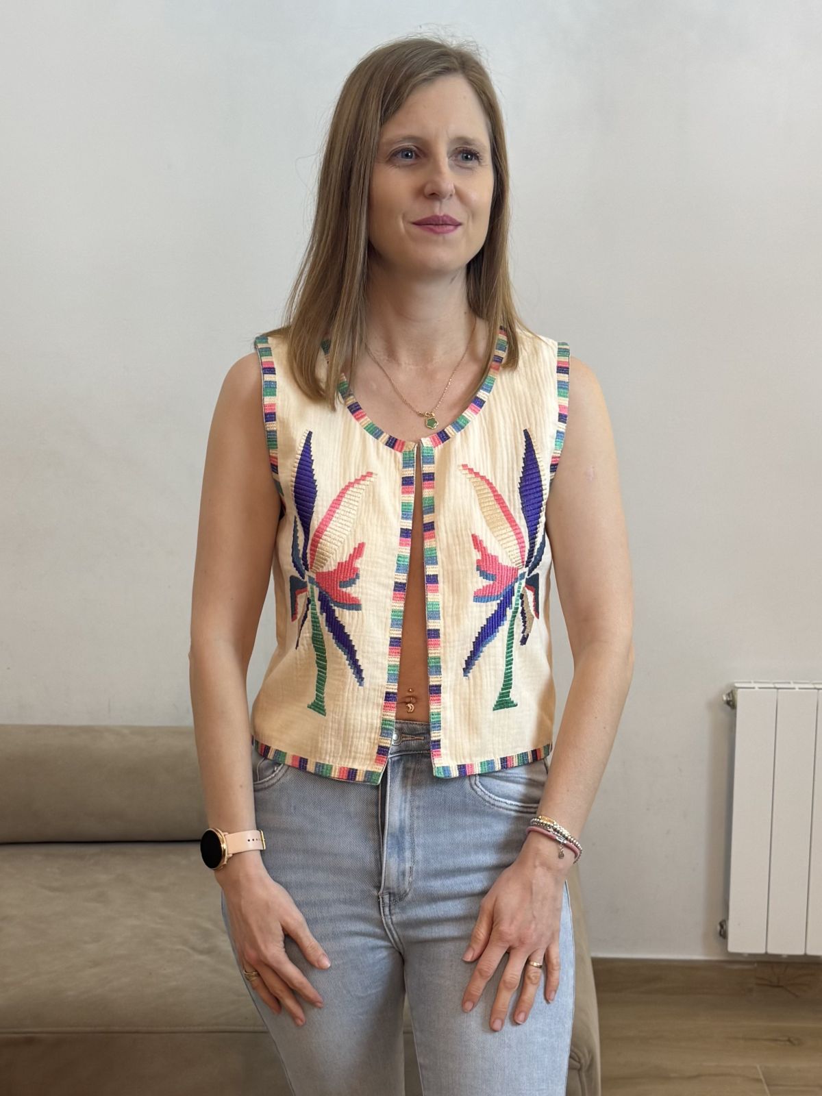 Chaleco de escote redondo y manga sisa. Detalle de bordado de palmera multicolor y acabados con vivos en contraste. Bajo recto.