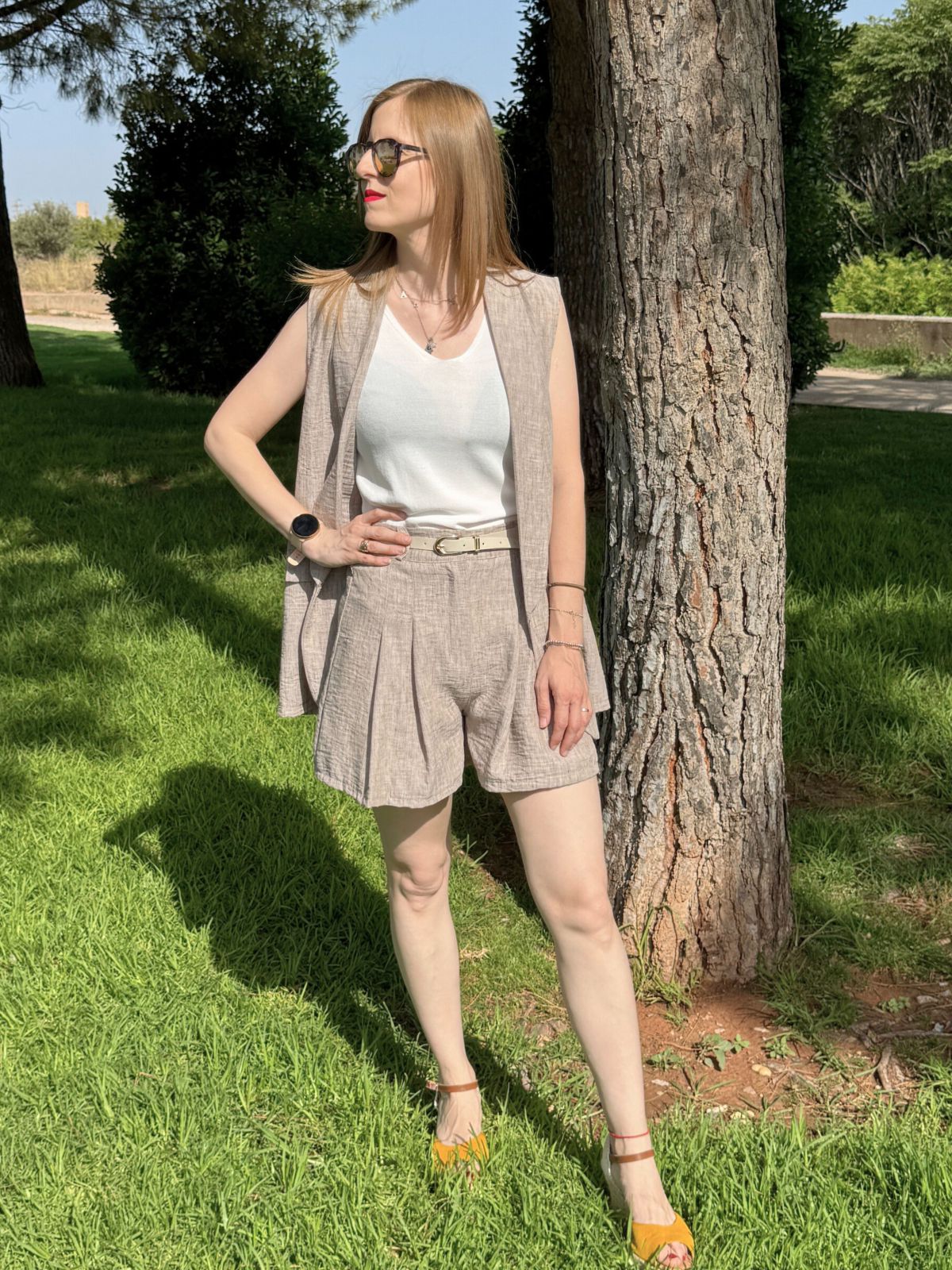Chaleco de escote pico y manga sisa. Detalle de tejido con textura efecto flamé y bajos rectos. Bermuda de tiro alto con trabillas. Detalle de pinzas marcadas en delantero. Cierre frontal con cremallera y botón.