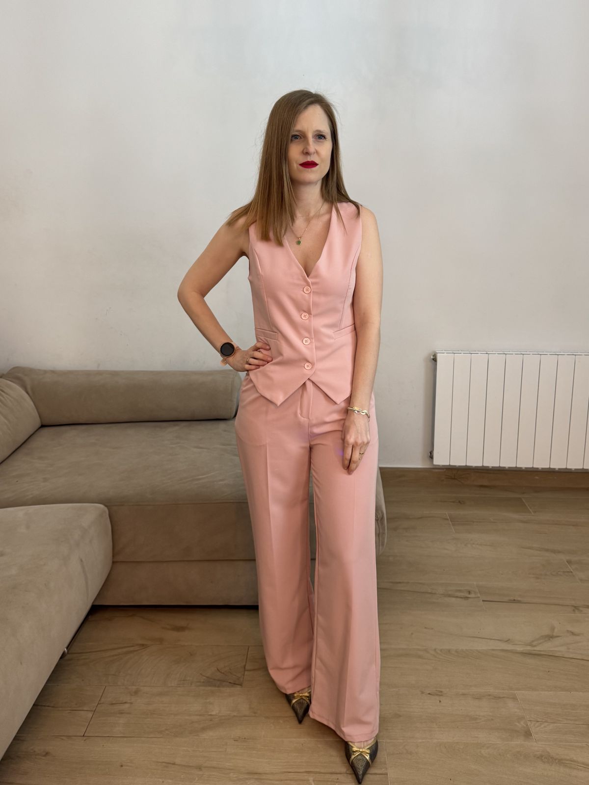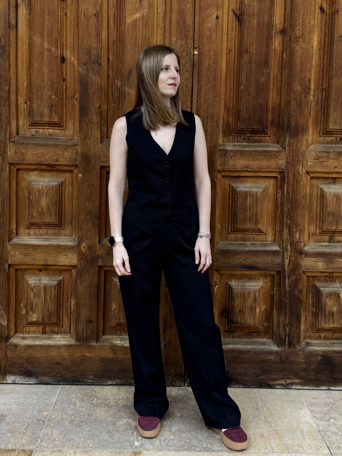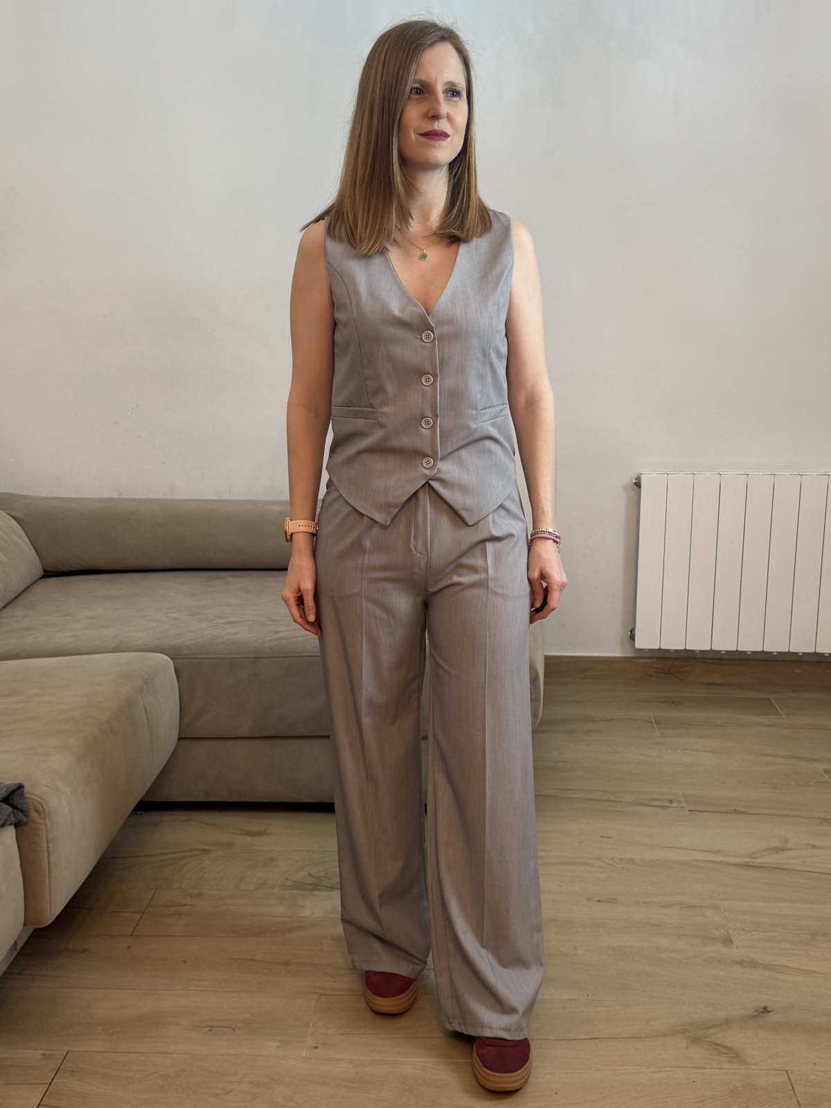 Chaleco de escote pico con cierre de botones y bolsillos de vivo decorativos combinado con pantalón de tiro alto con pinzas y pernera ancha de corte recto.