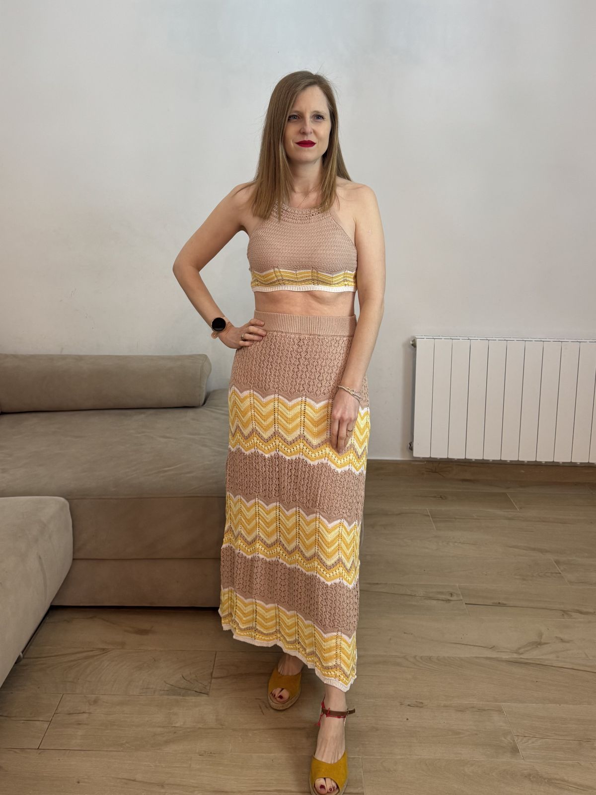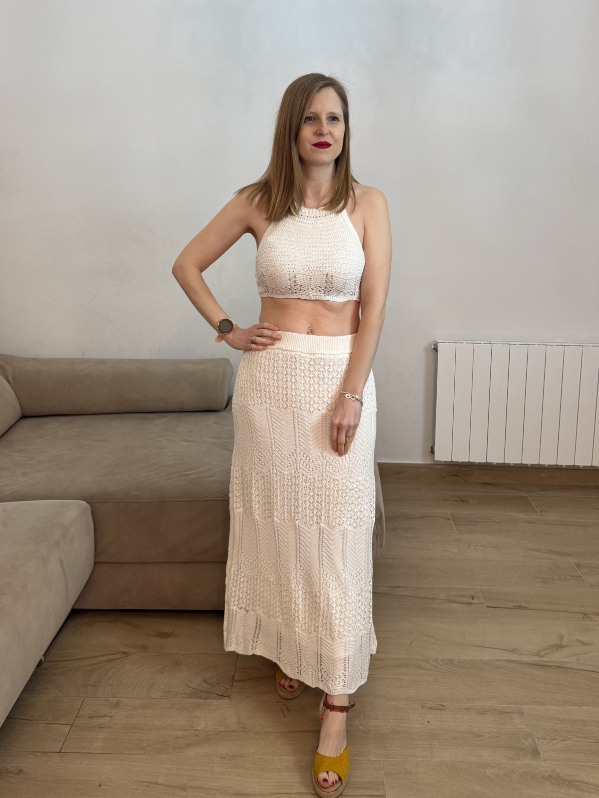 Conjunto de dos piezas confeccionado en tejido de punto con calados geométricos. Top corto de escote halter y espalda descubierta con cierre de lazada. Falda de talle alto con cintura elástica y caída fluida de largo midi. Acabados en rib y forro interior a tono.