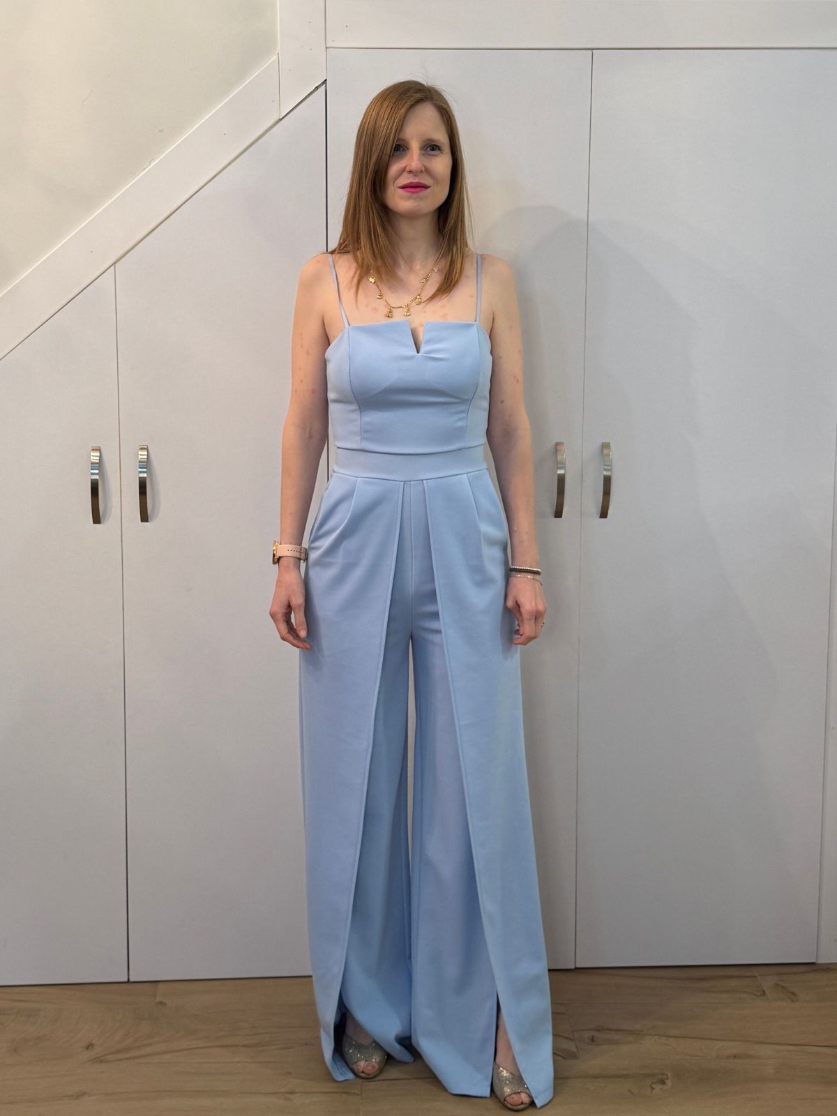 Mono largo de escote corazón con abertura central en V y tirantes finos. Detalle de piezas sobrepuestas en delantero con apertura lateral. Bolsillos laterales. Cierre en espalda con cremallera oculta en costura.