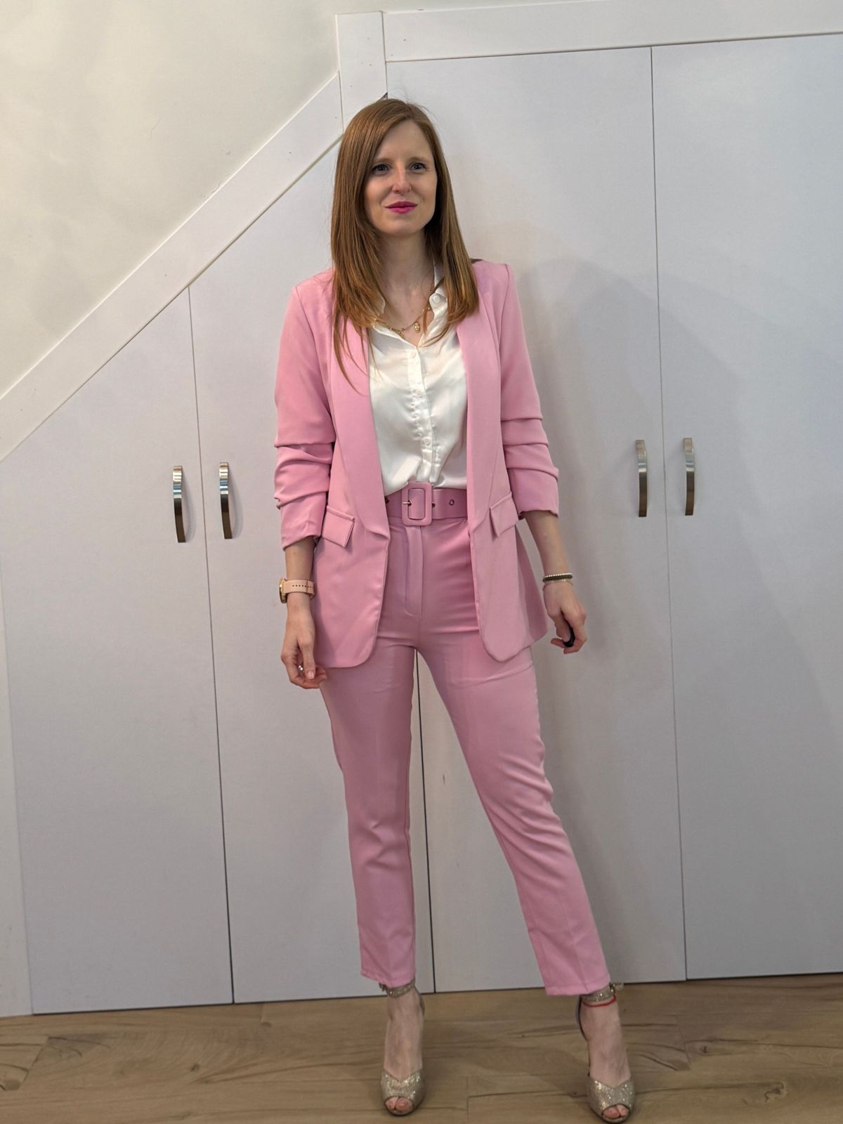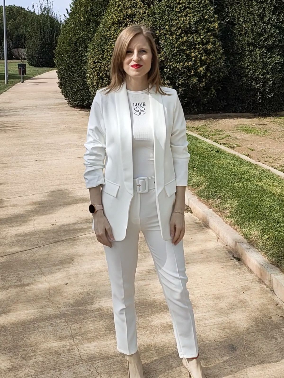 Pantalón de tiro alto con trabillas. Detalle de cinturón combinado a tono con hebilla forrada. Bolsillos laterales y línea de pierna entallada con raya marcada. Cierre frontal con cremallera y botón.