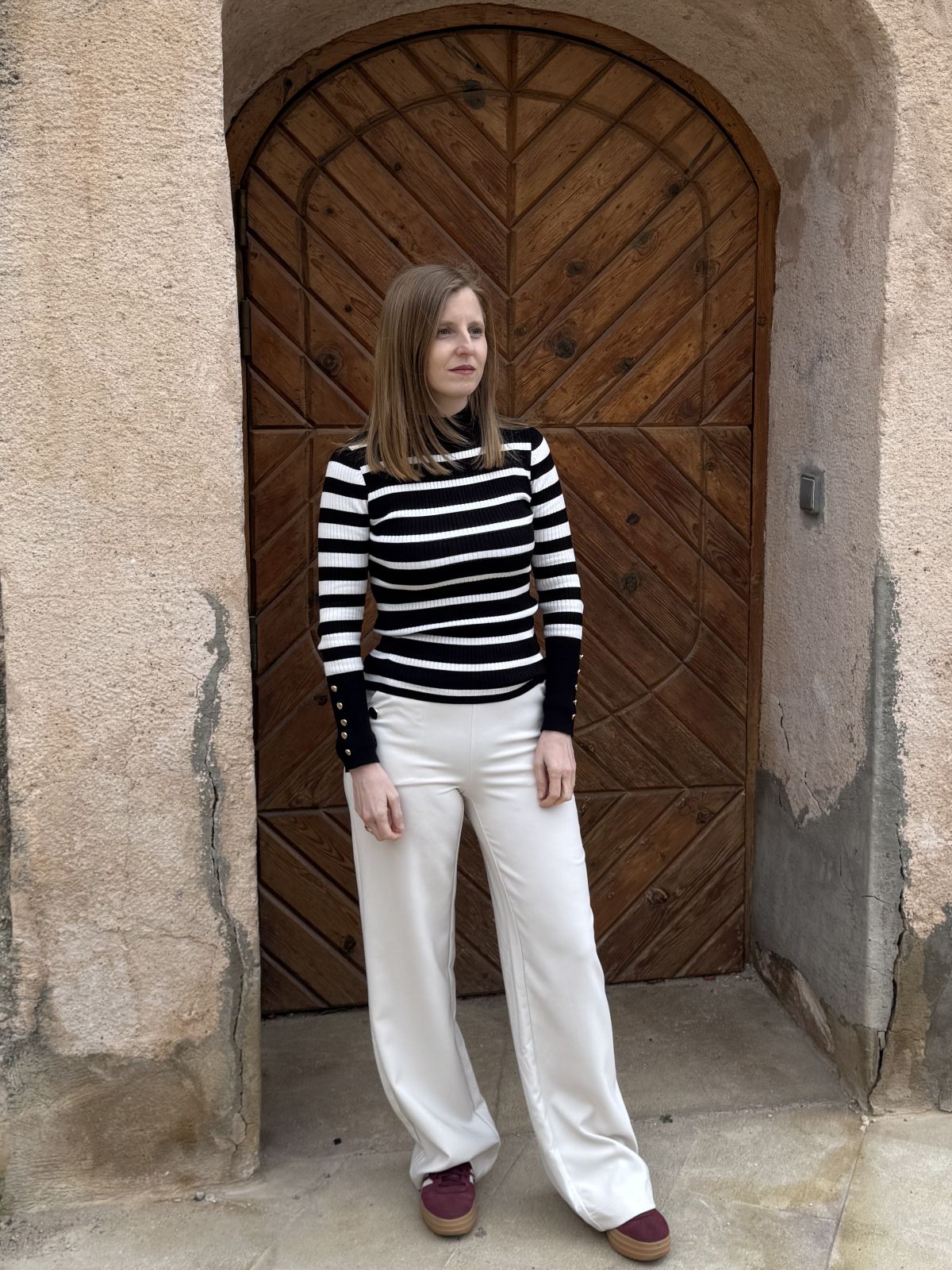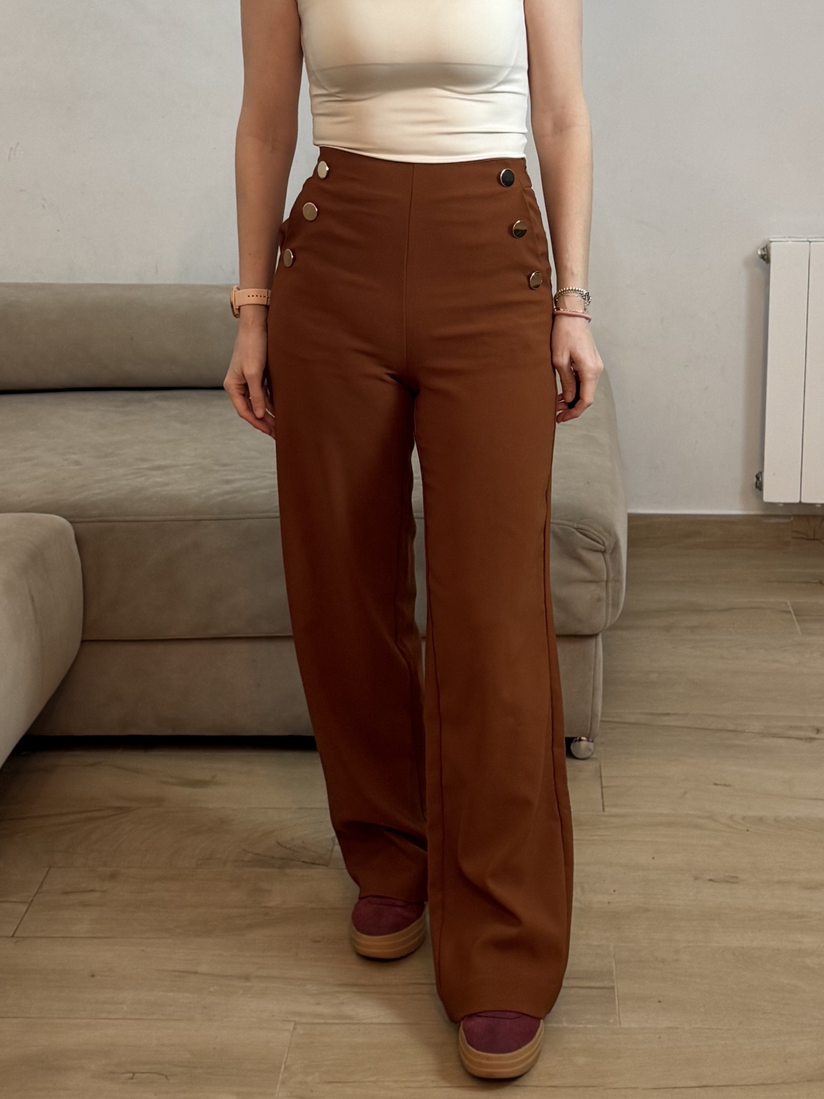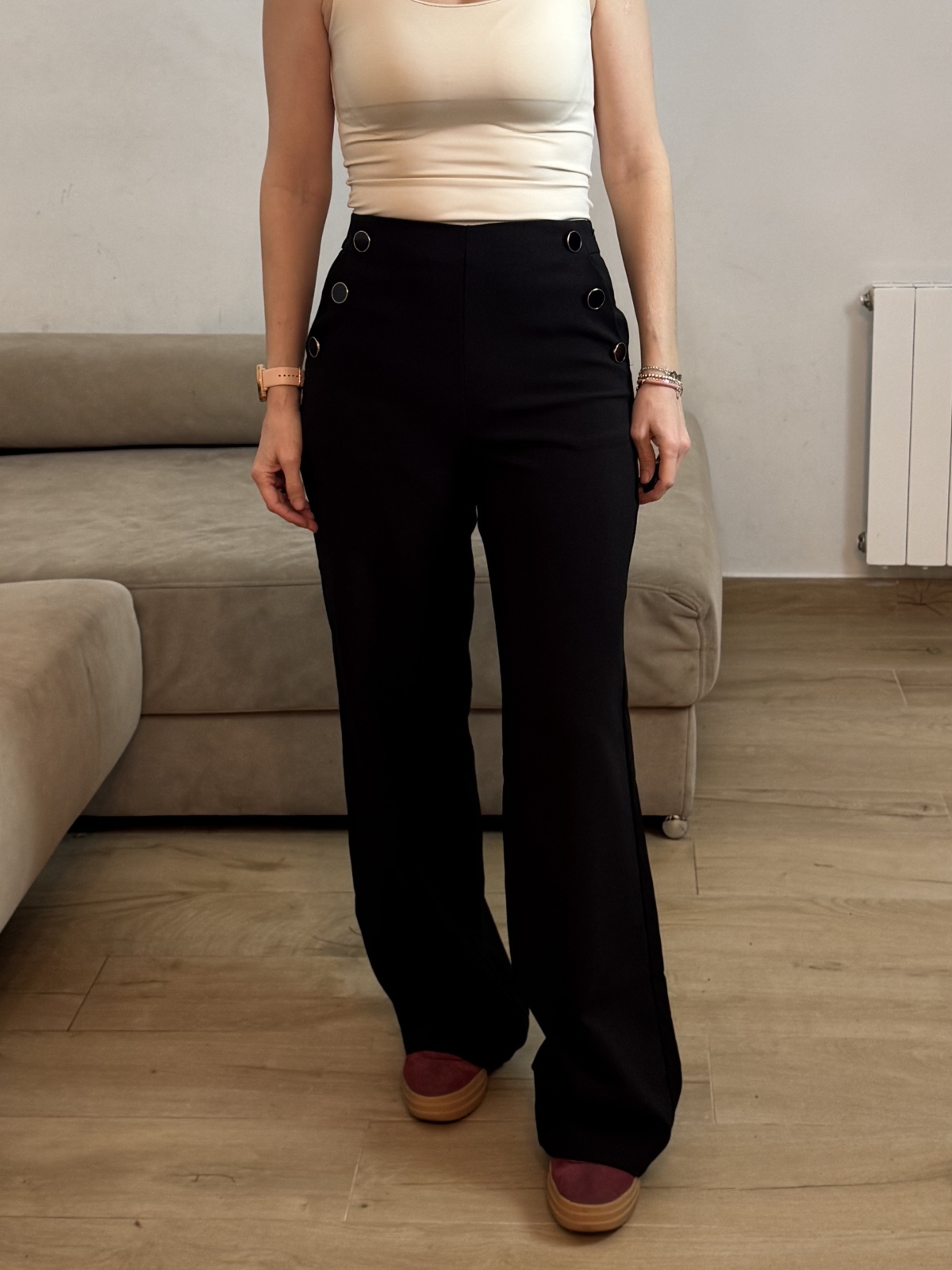 Pantalón de tiro alto con detalle de botones metálicos dorados en la parte delantera. Pernera ancha larga. Cierre lateral con cremallera oculta.