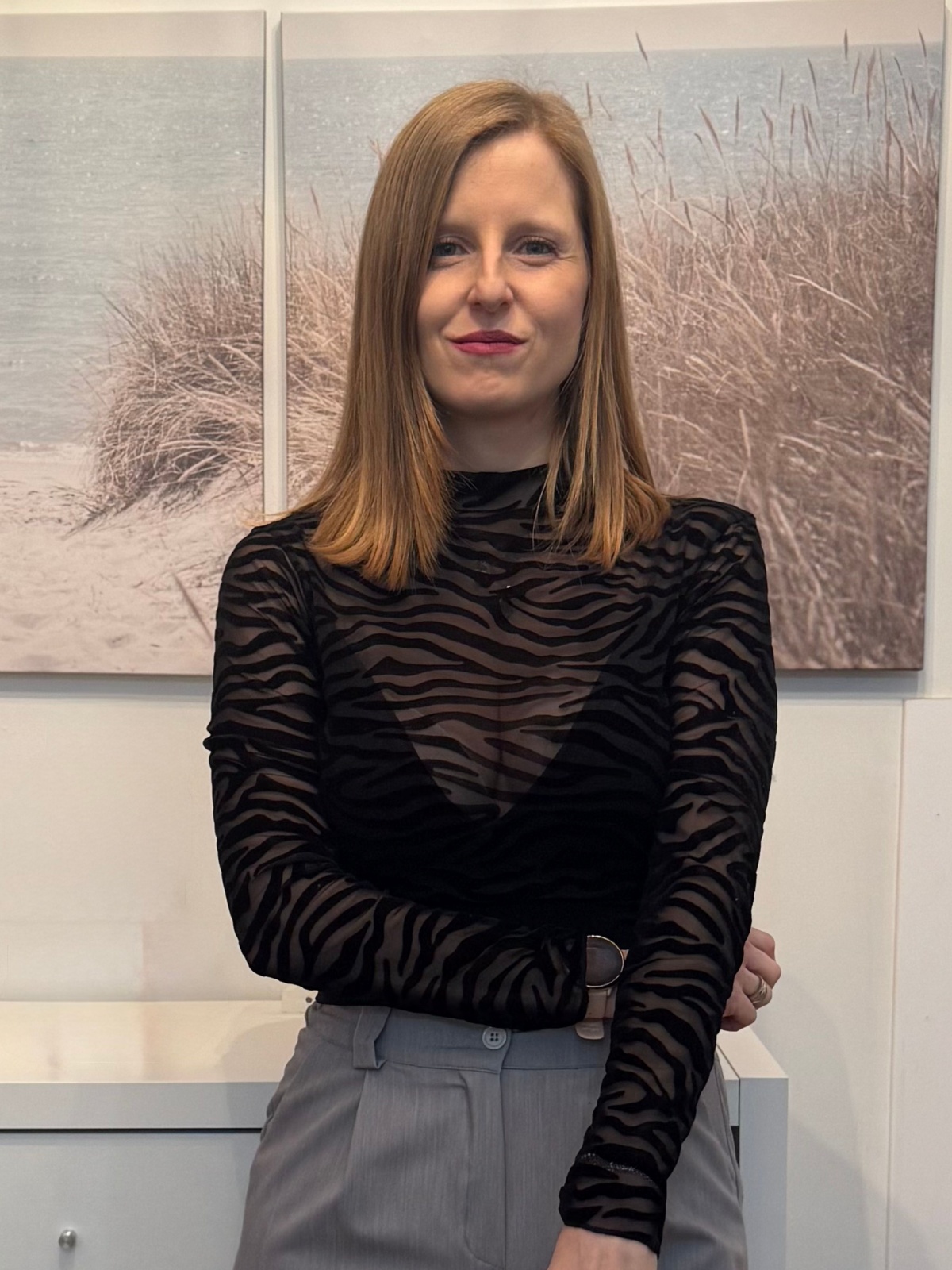 Top de cuello subido y manga larga confeccionado en tejido de tul elástico. Diseño con estampado en contraste sobre fondo transparente. Silueta ajustada al cuerpo con detalle de costuras planas y acabado del bajo recto. Ideal para combinar con prendas de talle alto.