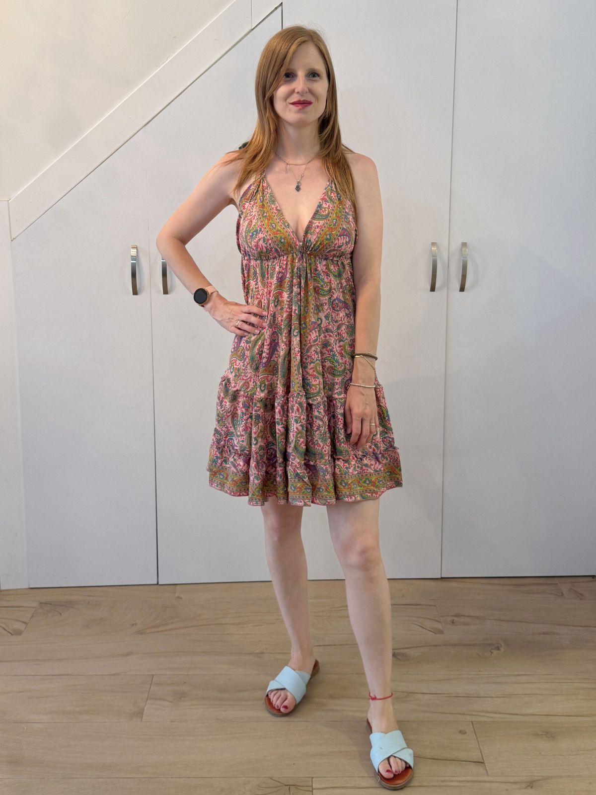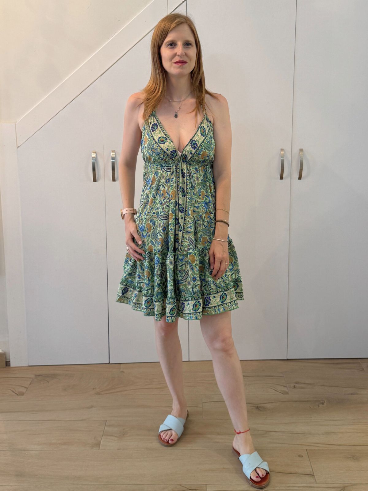 Vestido corto con escote en pico profundo y tirantes finos anudados al cuello. Detalle de cuerpo elástico tipo nido de abeja bajo el pecho para ajustar la silueta. Bajo acabado con volantes y vuelo. Tejido fluido con estampado de motivos ornamentales y florales.