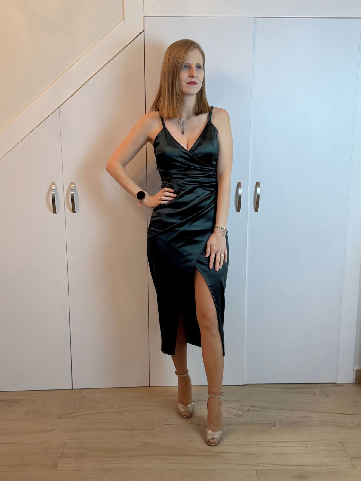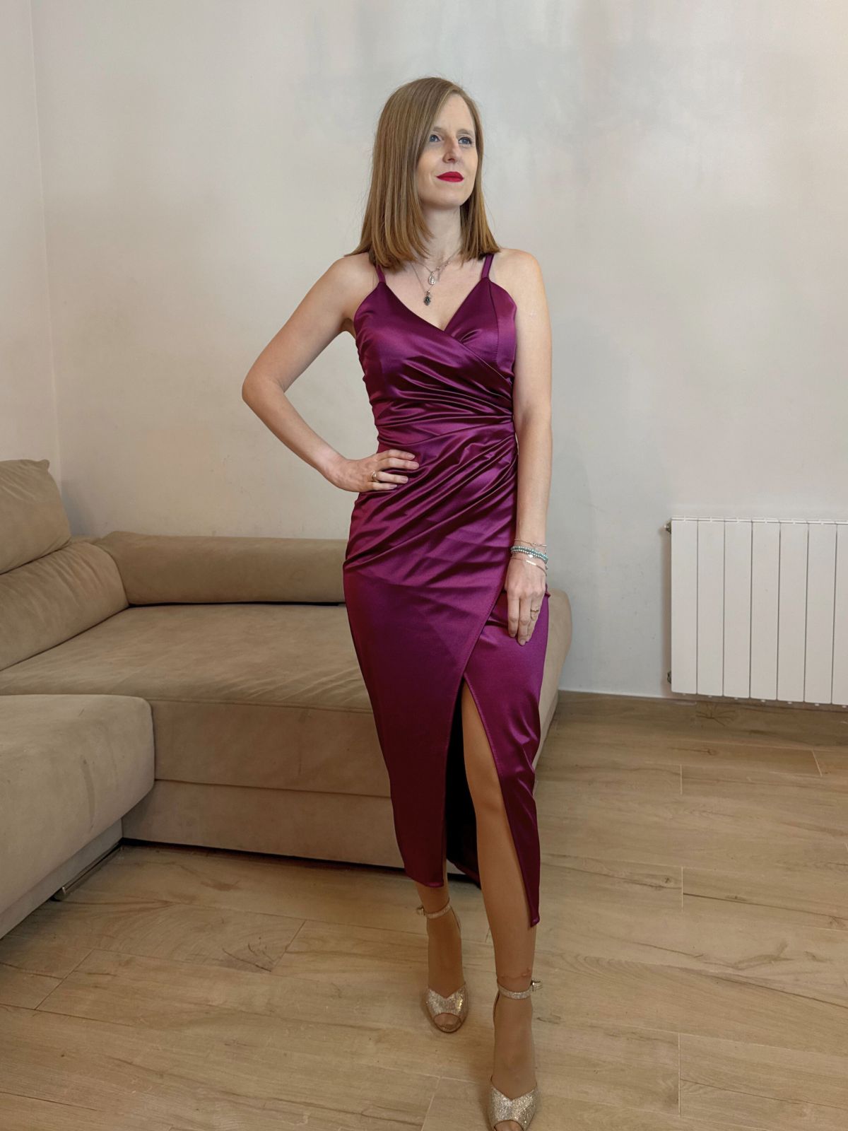 Vestido de escote pico cruzado y tirantes finos ajustables. Detalle de tejido fruncido en el lateral y abertura frontal en el bajo.